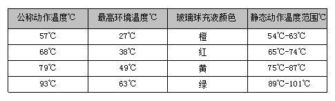 4、常用的玻璃球喷头公称动作温度及颜色标志: