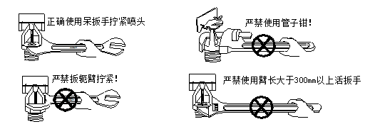3、喷头安装时应使用(22X24)的呆扳手的相应扳口,并注意正确使用,如下图。喷头拧紧力距